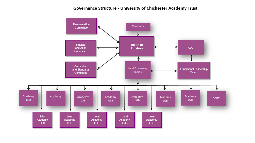 The governance within the University of Chichester Multi-Academy Trust is undertaken by Members, Trustees (sometimes called Directors) and Governors of individual academies. These people govern the Trust through the Trust Board and Local Governing Bodies who have delegated responsibilities from the Trust Board.